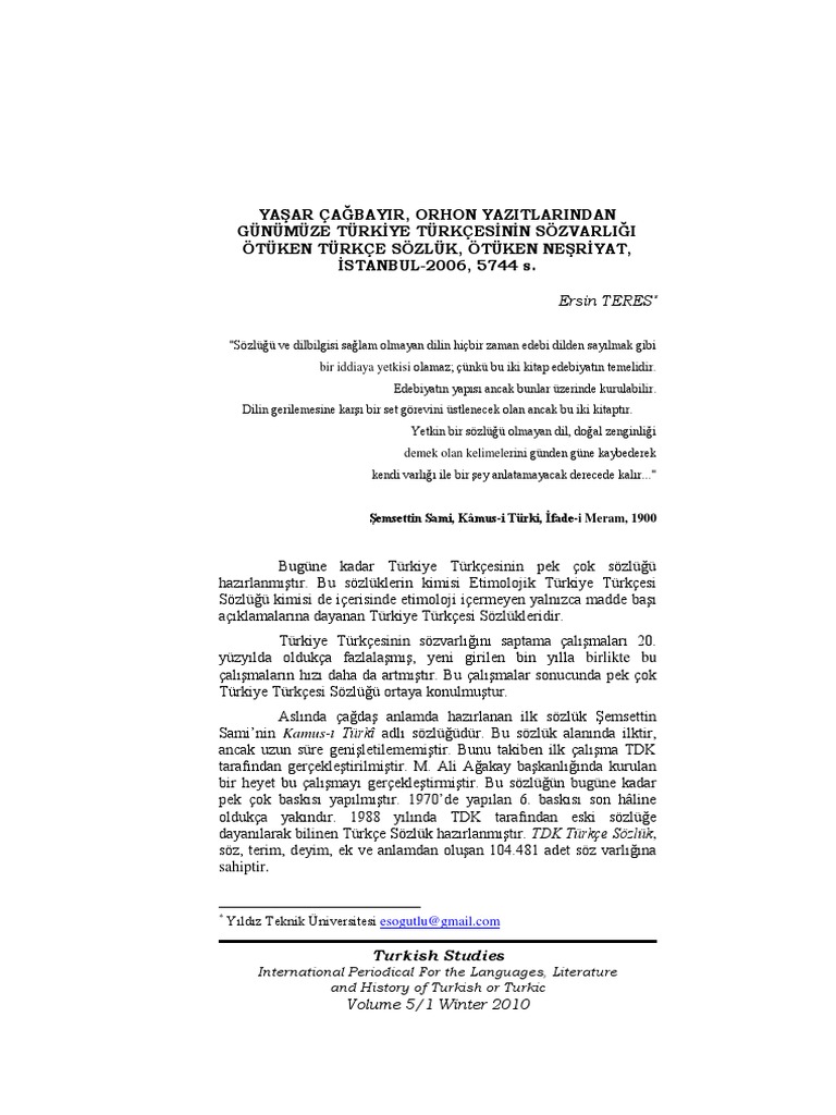 Yasar Cagbayir Orhon Yazitlarindan Gunumuze Turkiye Turkcesinin Sozvarligi Otuken Turkce Sozluk Otuken Nesriyat Istanbul 2006 5744 S