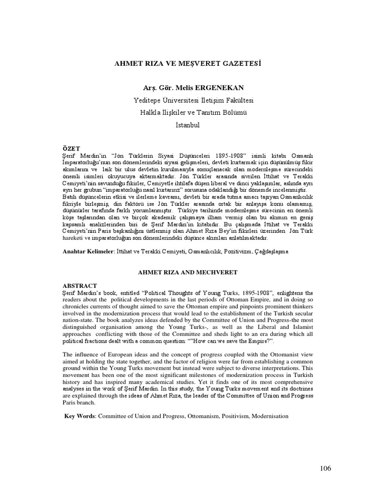 Ahmet Riza Ve Mesveret Gazetesi Yeditepe Universitesi Iletisim Fakultesi Halkla Iliskiler Ve Tanitim Bolumu Istanbul