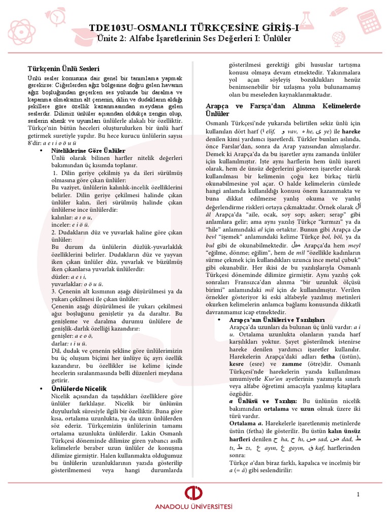 Anadolu Aof Osmanli Turkcesine Giris 1 2 Unite
